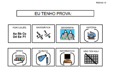 | Nº Visualizações: 2148 Nº Pranchas Relacionadas: 3 Tipo: BoardMaker Prancha Dinâmica: NÃO Descrição: Prancha de comunicação com a qual o usuário pode comentar sobre a prova, quando é, e como está se sentindo. Nível: iniciante Autor: Camilla Costa Profissão: Aluna de Graduação de Terapia Ocupacional da UFRJ E-mail: camillafcosta@gmail.com | |||||||||