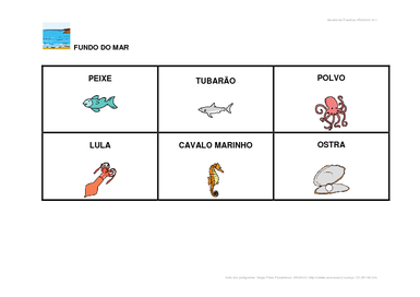 | Nº Visualizações: 1135 Nº Pranchas Relacionadas: 1 Tipo: Word Prancha Dinâmica: NÃO Descrição: Prancha de comunicação construídas com símbolos ARASAAC para escolha de animais marítimos. Prancha para imprimir. Nível: iniciante Autor: Bárbara Carvalho Profissão: Aluna de Graduação de Terapia Ocupacional da UFRJ E-mail: barbara.pcarvalho@hotmail.com | |||||||||