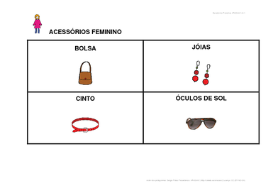 | Nº Visualizações: 1428 Nº Pranchas Relacionadas: 1 Tipo: Word Prancha Dinâmica: NÃO Descrição: Prancha de comunicação construída com símbolos ARASAAC para escolha de Acessórios Femininos. Prancha para imprimir. Nível: iniciante Autor: Bárbara Carvalho Profissão: Aluna de Graduação de Terapia Ocupacional da UFRJ E-mail: barbara.pcarvalho@hotmail.com | |||||||||