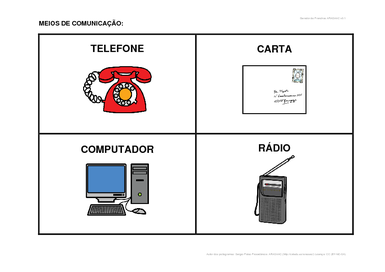 | Nº Visualizações: 1321 Nº Pranchas Relacionadas: 1 Tipo: Word Prancha Dinâmica: NÃO Descrição: Prancha elaborada com figuras do Portal ARASAAC sobre os meios de comunicação com 4 imagens. Para imprimir. Nível: iniciante Autor: Fernanda Garcia Profissão: Aluna de Graduação de Terapia Ocupacional da UFRJ E-mail: fernandiinha05@hotmail.com | |||||||||