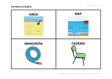 | Nº Visualizações: 968 Nº Pranchas Relacionadas: 1 Tipo: Word Prancha Dinâmica: NÃO Descrição: Prancha elaborada com material do Portal ARASAAC sobre coisas que gostaria de fazer na praia. Prancha com 4 símbolos para imprimir. Nível: iniciante Autor: Fernanda Garcia Profissão: Aluna de Graduação de Terapia Ocupacional da UFRJ E-mail: fernandiinha05@hotmail.com | |||||||||