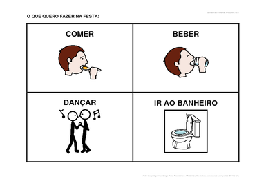 | Nº Visualizações: 1075 Nº Pranchas Relacionadas: 1 Tipo: Word Prancha Dinâmica: NÃO Descrição: Prancha elaborada com material do Portal ARASAAC sobre coisas que gostaria de fazer numa festa. Prancha com 4 símbolos para imprimir. Nível: iniciante Autor: Fernanda Garcia Profissão: Aluna de Graduação de Terapia Ocupacional da UFRJ E-mail: fernandiinha05@hotmail.com | |||||||||