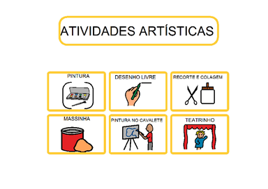 | Nº Visualizações: 1261 Nº Pranchas Relacionadas: 1 Tipo: BoardMaker Prancha Dinâmica: NÃO Descrição: Prancha para ser impressa com 6 opções de atividades artísticas para escolher. Nível: iniciante Autor: Dayse Cunha Profissão: Professora de Sala de Recursos Multifuncional E-mail: dc_catarina@yahoo.com.br | |||||||||