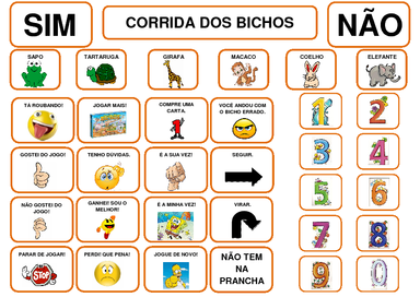 | Nº Visualizações: 1065 Nº Pranchas Relacionadas: 1 Tipo: Word Prancha Dinâmica: NÃO Descrição: Prancha de comunicação para o jogo Corrida dos Bichos. Além de jogar, é possível interagir com os outros participantes. Atividade desenvolvida pelo Projeto TO Brincando da UFRJ. Nível: iniciante Autor: Jessika Hanako Kojima Profissão: Aluna de Graduação de Terapia Ocupacional da UFRJ E-mail: jessikahanako@hotmail.com | |||||||||