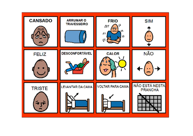 | Nº Visualizações: 1219 Nº Pranchas Relacionadas: 1 Tipo: BoardMaker Prancha Dinâmica: NÃO Descrição: A prancha contém opções de solicitações que poderão ser feitas aos cuidadores ou à equipe de enfermagem. Nível: iniciante Autor: Nayana Rodrigues Profissão: Aluna de Graduação de Fonoaudiologia E-mail: naya_rodrigues@hotmail.com | |||||||||