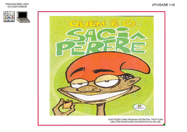 | Nº Visualizações: 2776 Nº Pranchas Relacionadas: 15 Tipo: SDP Prancha Dinâmica: SIM Descrição: Atividade para ser usada no computador ou impressa. Narra a história do Saci, e contém perguntas de interpretação sobre a história contada. Nível: iniciante Autor: Ilma Lapa Profissão: Professora de Sala de Recursos Multifuncional E-mail: ilmaplapa@hotmail.com | |||||||||