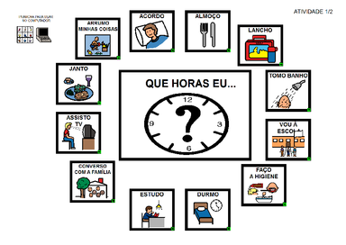 | Nº Visualizações: 1805 Nº Pranchas Relacionadas: 2 Tipo: SDP Prancha Dinâmica: SIM Descrição: Atividade para ser usada no computador ou impressa. Através dela, o usuário pode demonstrar em que horários realiza certas atividades. Pode ser utilizada com varredura ou acesso direto. Nível: intermediário Autor: Maria Aparecida Profissão: Professor de Sala de Recursos Multifuncional E-mail: pereira.familia@oi.com.br | |||||||||