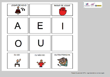 | Nº Visualizações: 875 Nº Pranchas Relacionadas: 4 Tipo: Word Prancha Dinâmica: NÃO Descrição: Exemplo de pranchas para comunicadores para o Jogo Aprendendo com as vogais. Nível: iniciante Autor: Projeto TO Brincando Profissão: Universidade Federal do Rio de Janeiro E-mail: tobrincandoufrj@gmail.com | |||||||||