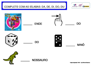 | Nº Visualizações: 1043 Nº Pranchas Relacionadas: 12 Tipo: Invento Prancha Dinâmica: NÃO Descrição: Atividade Pedagógica de Português com sílabas. Atividade desenvolvida pelo projeto TO Brincando da UFRJ para o jogo Floresta Encantada. Nível: intermediário Autor: Projeto TO Brincando Profissão: Universidade Federal do Rio de Janeiro E-mail: tobrincandoufrj@gmail.com | |||||||||