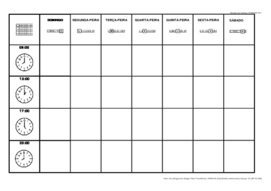 | Nº Visualizações: 1194 Nº Pranchas Relacionadas: 1 Tipo: Word Prancha Dinâmica: NÃO Descrição: Horário com os 7 dias da semana para que haja uma organização dos compromissos. Nível: iniciante Autor: Nayana Rodrigues Profissão: Aluna de Graduação de Fonoaudiologia E-mail: naya_rodrigues@hotmail.com | |||||||||