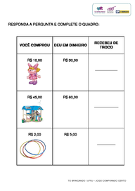 | Nº Visualizações: 1035 Nº Pranchas Relacionadas: 6 Tipo: Word Prancha Dinâmica: NÃO Descrição: Atividade de matemática. Atividade desenvolvida para o jogo Comprando Certo no projeto TOBrincando da UFRJ. Nível: intermediário Autor: TObrincando Profissão: Universidade Federal do Rio de Janeiro E-mail: tobrincandoufrj@gmail.com | |||||||||