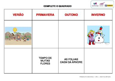 | Nº Visualizações: 877 Nº Pranchas Relacionadas: 12 Tipo: Word Prancha Dinâmica: NÃO Descrição: Atividade de completar o quadro com as características das estações do ano. Atividade desenvolvida pelo projeto TOBrincando da UFRJ a partir do Jogo da Mesada. Nível: avançado Autor: TObrincando Profissão: Universidade Federal do Rio de Janeiro E-mail: tobrincandoufrj@gmail.com | |||||||||