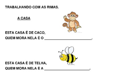 | Nº Visualizações: 1220 Nº Pranchas Relacionadas: 6 Tipo: Word Prancha Dinâmica: NÃO Descrição: Atividade pedagógica para ser impressa. Os espaços devem ser preenchidos com a palavra correspondente formando a rima. Nível: iniciante Autor: Nathalia Pereira Amado Profissão: Estudante de Terapia Ocupacional E-mail: amadonathi@hotmail.com | |||||||||