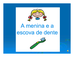 | Nº Visualizações: 1706 Nº Pranchas Relacionadas: 12 Tipo: PowerPoint Prancha Dinâmica: SIM Descrição: Atividade para ser usada no computador ou impressa que conta a história da menina e a escova de dente e, depois, possui perguntas de interpretação. Nível: intermediário Autor: Petra Castiglioni Muniz Puget Profissão: Aluna de Graduação de Terapia Ocupacional da UFRJ E-mail: petracastiglioni@gmail.com | |||||||||
