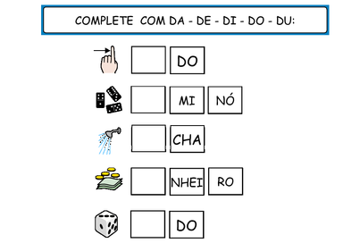 | Nº Visualizações: 939 Nº Pranchas Relacionadas: 16 Tipo: Invento Prancha Dinâmica: NÃO Descrição: Atividade desenvolvida pelo Projeto TO Brincando para completar as palavras com as sílabas que faltam. Nível: iniciante Autor: TObrincando Profissão: Universidade Federal do Rio de Janeiro E-mail: tobrincandoufrji@gmail.com | |||||||||
