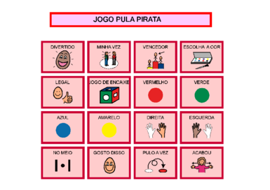 | Nº Visualizações: 905 Nº Pranchas Relacionadas: 1 Tipo: BoardMaker Prancha Dinâmica: NÃO Descrição: Prancha de comunicação sobre o jogo Pula Pirata. Nível: iniciante Autor: Patricia Souza Profissão: Estudante de Terapia Ocupacional E-mail: p.s.nery@hotmail.com | |||||||||