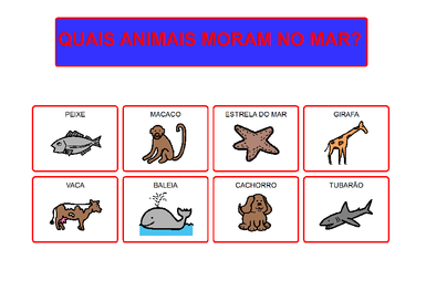| Nº Visualizações: 822 Nº Pranchas Relacionadas: 1 Tipo: BoardMaker Prancha Dinâmica: NÃO Descrição: Atividade que solicita a escolha dos animais que vivem no mar. Nível: iniciante Autor: Wanessa de Vasconcellos Araújo Profissão: Estudante de Terapia Ocupacional E-mail: wanessavaraujo@gmail.com | |||||||||
