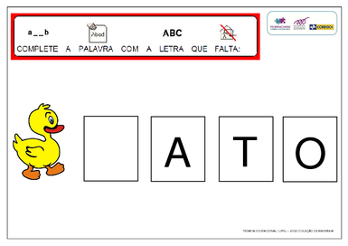 | Nº Visualizações: 969 Nº Pranchas Relacionadas: 7 Tipo: Word Prancha Dinâmica: NÃO Descrição: Atividade de completar a palavra com as letras que estão faltando. Atividade desenvolvida pelo projeto TOBrincando da UFRJ para o jogo Coleção de Massinha-(Dr. Opera Tudo; Criando com a Turma da Mônica; Brincando na Escola; Bichos e Cabelos) Nível: iniciante Autor: TObrincando Profissão: Universidade Federal do Rio de Janeiro E-mail: tobrincandoufrj@gmail.com | |||||||||