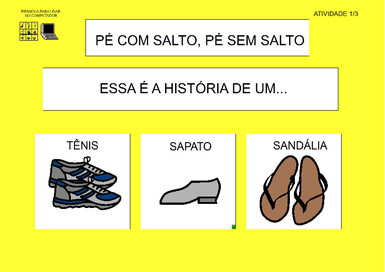 | Nº Visualizações: 1356 Nº Pranchas Relacionadas: 3 Tipo: SDP Prancha Dinâmica: SIM Descrição: Atividade para ser usada no computador ou impressa. Contém perguntas sobre a história do sapato, que deve ser previamente contada. Pode ser utilizada com varredura ou acesso direto. Nível: iniciante Autor: Renata Torres de Souza Profissão: Professora de Sala de Recursos Multifuncional E-mail: torressrenata@gmail.com | |||||||||