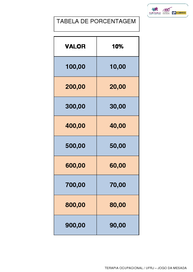 | Nº Visualizações: 1109 Nº Pranchas Relacionadas: 2 Tipo: Word Prancha Dinâmica: NÃO Descrição: Tabela com os valores da porcentagem para apoiar o jogo da Mesada. Atividade desenvolvida pelo Projeto TOBrincando da UFRJ. Nível: intermediário Autor: TObrincando Profissão: Universidade Federal do Rio de Janeiro E-mail: tobrincandoufrj@gmail.com | |||||||||