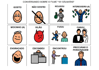 | Nº Visualizações: 970 Nº Pranchas Relacionadas: 2 Tipo: BoardMaker Prancha Dinâmica: NÃO Descrição: Prancha de comunicação para ser utilizada para conversar sobre os personagens do filme da Disney "101 Dálmatas". Nível: iniciante Autor: Nayana Rodrigues Profissão: Aluna de Graduação de Fonoaudiologia E-mail: naya_rodrigues@hotmail.com | |||||||||