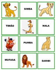 | Nº Visualizações: 1132 Nº Pranchas Relacionadas: 2 Tipo: Word Prancha Dinâmica: NÃO Descrição: Jogo da memória com os personagens do filme O Rei Leão. O objetivo é associar a imagem do personagem com o nome correspondente para formar os pares. A atividade deve ser impressa. Nível: iniciante Autor: Nathalia Pereira Amado Profissão: Estudante de Terapia Ocupacional E-mail: amadonathi@hotmail.com | |||||||||