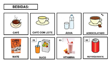 | Nº Visualizações: 1001 Nº Pranchas Relacionadas: 1 Tipo: Word Prancha Dinâmica: NÃO Descrição: Prancha de comunicação para ser impressa com opções de bebidas. Nível: iniciante Autor: Nathalia Pereira Amado Profissão: Estudante de Terapia Ocupacional E-mail: amadonathi@hotmail.com | |||||||||
