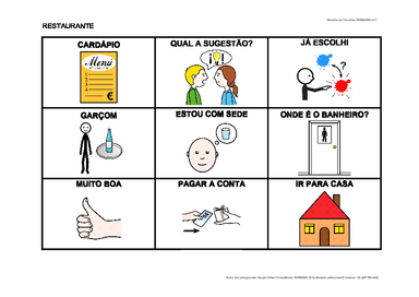 | Nº Visualizações: 692 Nº Pranchas Relacionadas: 1 Tipo: Word Prancha Dinâmica: NÃO Descrição: Prancha desenvolvida no Portal ARASAAC, utilizando o gerador de pranchas com opções de 3x3, com o objetivo de auxiliar a comunicação no restaurante. Nível: iniciante Autor: Helena de Souza Ferreira Profissão: Estudante E-mail: heelena_fer@hotmail.com | |||||||||
