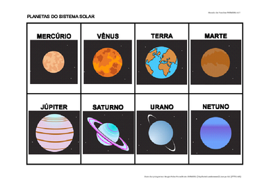 | Nº Visualizações: 925 Nº Pranchas Relacionadas: 1 Tipo: Word Prancha Dinâmica: NÃO Descrição: Prancha desenvolvida no Portal ARASAAC, utilizando o gerador de pranchas com a opção 2x4, com o objetivo de ensinar quais são os planetas que compõem o sistema solar. Nível: iniciante Autor: Helena de Souza Ferreira Profissão: Estudante E-mail: heelena_fer@hotmail.com | |||||||||
