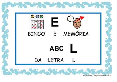 | Nº Visualizações: 1014 Nº Pranchas Relacionadas: 9 Tipo: Invento Prancha Dinâmica: NÃO Descrição: Bingo com palavras e figuras da letra L. Atividade desenvolvida pelo projeto TO BRINCANDO. Nível: intermediário Autor: TObrincando Profissão: Universidade Federal do Rio de Janeiro E-mail: tobrincandoufrji@gmail.com | |||||||||