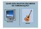 | Nº Visualizações: 1330 Nº Pranchas Relacionadas: 15 Tipo: PowerPoint Prancha Dinâmica: SIM Descrição: Essa atividade retrata os meios de comunicação. Nível: intermediário Autor: Priscila da C. Rodrigues Profissão: Estudante de Terapia Ocupacional da UFRJ E-mail: priscila.rodriguesto@gmail.com | |||||||||