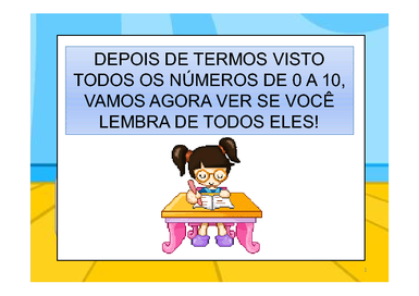 | Nº Visualizações: 1443 Nº Pranchas Relacionadas: 37 Tipo: PowerPoint Prancha Dinâmica: SIM Descrição: Esta atividade pode ser usada como complemento da apresentação "CONHECENDO OS NÚMEROS DE 0 A 10" que também encontra-se neste Portal. Essa atividade tem como objetivo ensinar a noção de quantidade e o valor real dos números de 0 a 10. Consiste em slides com perguntas sobre as quantidades apresentadas em conjuntos. Nível: intermediário Autor: Márcia Ribeiro de Lima Profissão: Estudante de Terapia Ocupacional - UFRJ E-mail: marciaribeiro.to@ufrj.br | |||||||||