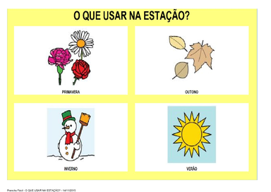 | Nº Visualizações: 3072 Nº Pranchas Relacionadas: 5 Tipo: Prancha Fácil Prancha Dinâmica: SIM Descrição: Atividades desenvolvida com o software Prancha Fácil sobre estações do ano. Nível: iniciante Autor: Aline Rocha Rodrigues Profissão: Estudante de Graduacão do Curso de Terapia Ocupacional E-mail: aline_rocharodrigues@hotmail.com | |||||||||