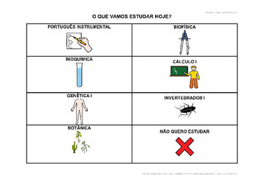 | Nº Visualizações: 774 Nº Pranchas Relacionadas: 1 Tipo: Word Prancha Dinâmica: NÃO Descrição: Prancha de comunicação de um aluno que cursa Ciências Biológicas na Universidade Estadual do Sudoeste da Bahia. Nela constam as disciplinas que ele cursa no primeiro semestre. Nível: iniciante Autor: Sally da Conceição Soares Oliveira Profissão: E-mail: | |||||||||
