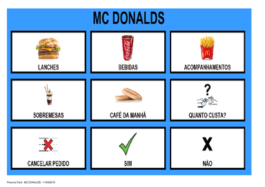 | Nº Visualizações: 854 Nº Pranchas Relacionadas: 14 Tipo: Prancha Fácil Prancha Dinâmica: SIM Descrição: Prancha de Comunicação para o restaurante Mc Donalds. Material desenvolvida pelo Laboratório de Tecnologia Assistiva - UFRJ Nível: iniciante Autor: LabAssistiva - UFRJ Profissão: Laboratório de Tecnologia Assistiva do Departamento de Terapia Ocupacional da UFRJ E-mail: labassistivaufrj@gmail.com | |||||||||