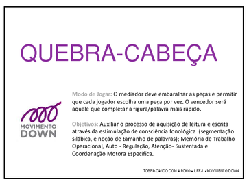 | Nº Visualizações: 807 Nº Pranchas Relacionadas: 12 Tipo: TOBrincando com a Fono Prancha Dinâmica: NÃO Descrição: Jogo utilizado para o KIT 1 de estratégia de mediação baseada na obra de Sônia Junqueira: O pato e o Sapo. Objetivo: Noção de sílabas de palavras simples. Nível: iniciante Autor: Projeto TO Brincando com a Fono Profissão: Universidade Federal do Rio de Janeiro E-mail: tobrincandoufrj@gmail.com | |||||||||
