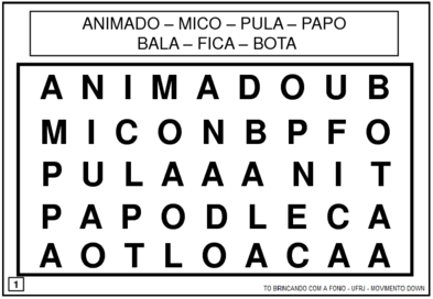| Nº Visualizações: 1029 Nº Pranchas Relacionadas: 5 Tipo: TOBrincando com a Fono Prancha Dinâmica: NÃO Descrição: Atividades utilizadas para o KIT 1 de estratégia de remediação baseada na obra de Sônia Junqueira: O Pato e o Sapo. Nível: intermediário Autor: Projeto TO Brincando com a Fono Profissão: Universidade Federal do Rio de Janeiro E-mail: tobrincandoufrj@gmail.com | |||||||||
