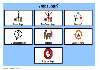 | Nº Visualizações: 850 Nº Pranchas Relacionadas: 5 Tipo: Prancha Fácil Prancha Dinâmica: SIM Descrição: Prancha de comunicação criada para auxiliar no jogo Pula Macaco feita no software Prancha Fácil. Nível: iniciante Autor: Maria Grassato de Carvalho Profissão: estudante de Terapia Ocupacional E-mail: mariagc2000@hotmail.com | |||||||||