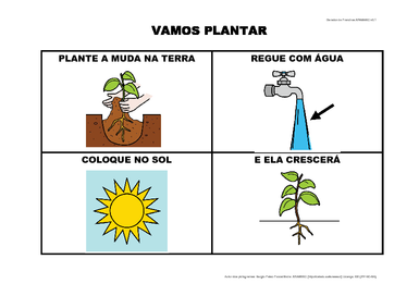 | Nº Visualizações: 1254 Nº Pranchas Relacionadas: 1 Tipo: ARASAAC Prancha Dinâmica: NÃO Descrição: Prancha de Comunicação demonstrando quatro passos para cultivar uma muda de Planta. Nível: intermediário Autor: KARINE GUEDES FERREIRA Profissão: ACADÊMICA DE TERAPIA OCUPACIONAL E-mail: karineto.87@outlook.com | |||||||||
