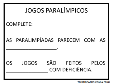 | Nº Visualizações: 778 Nº Pranchas Relacionadas: 7 Tipo: TOBrincando com a Fono Prancha Dinâmica: SIM Descrição: Essa atividade é sobre as paralimpíada e algumas modalidades de esportes. Ela foi baseada no texto da atividade "Jogos Olímpicos e Paralímpicos", possui tarefas de completar, escrever e colorir. Nível: iniciante Autor: Projeto TO Brincando com a Fono Profissão: Universidade Federal do Rio de Janeiro E-mail: tobrincandoufrj@gmail.com | |||||||||