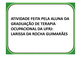 | Nº Visualizações: 1177 Nº Pranchas Relacionadas: 29 Tipo: PowerPoint Prancha Dinâmica: SIM Descrição: Atividade feita para usar no computador que ensina ao usuário quem foi Tiradentes e o que ele fez. Depois da história são feitas algumas perguntas para fixação do conteúdo. Nível: iniciante Autor: Larissa da Rocha Guimarães Profissão: Aluna de Graduação de Terapia Ocupacional da UFRJ E-mail: l.rocha08@gmail.com | |||||||||