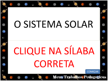 | Nº Visualizações: 906 Nº Pranchas Relacionadas: 25 Tipo: PowerPoint Prancha Dinâmica: SIM Descrição: Esse jogo foi desenvolvido em PowerPoint. A criança deve clicar na sílaba inicial correta do nome do planeta. Nível: iniciante Autor: Vanessa Aparecida Ortiz Profissão: Professora de Informática Educativa E-mail: vanessaortiz2009@terra.com.br | |||||||||