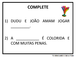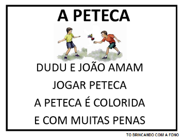 | Nº Visualizações: 1061 Nº Pranchas Relacionadas: 4 Tipo: TOBrincando com a Fono Prancha Dinâmica: NÃO Descrição: Atividade de Interpretação de texto. A criança deve ler o texto e completar as frases com as palavras que faltam. Baseado nos mesmos fonemas do Livro O Peru de Peruca. Nível: intermediário Autor: Projeto TO Brincando com a Fono Profissão: Universidade Federal do Rio de Janeiro E-mail: tobrincandoufrj@gmail.com | |||||||||