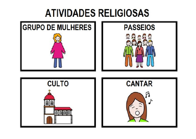 | Nº Visualizações: 910 Nº Pranchas Relacionadas: 4 Tipo: Prancha Fácil Prancha Dinâmica: NÃO Descrição: Conjunto de pranchas referentes ao tema religião. Nível: iniciante Autor: Comunicação Alternativa em Hospitais: Levantamento de vocabulário para uso no ambiente hospitalar Profissão: Terapeuta Ocupacional E-mail: isabelabhernandes@gmail.com | |||||||||