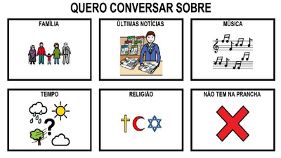 | Nº Visualizações: 829 Nº Pranchas Relacionadas: 1 Tipo: Prancha Fácil Prancha Dinâmica: NÃO Descrição: Prancha com opções de conversa para ser usada no contexto hospitalar. Nível: iniciante Autor: Projeto de Comunicação Alternativa Profissão: Terapia Ocupacional E-mail: kvalle.ufrj@gmail.com | |||||||||