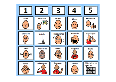 | Nº Visualizações: 1004 Nº Pranchas Relacionadas: 1 Tipo: Comunicar com Símbolos Prancha Dinâmica: NÃO Descrição: Prancha idealizada para atendimento de usuária com síndrome do encarceramento, para atendimento psicológico. Baseada em pranchas disponibilizadas neste portal. Usuária escolhe a coluna e posteriormente o sentimento, pode ser utilizada apontando, movimento de cabeça ou dos olhos. Nível: iniciante Autor: Juliana Nepomuceno Aroni Profissão: Terapeuta Ocupacional E-mail: julianaroni@gmail.com | |||||||||