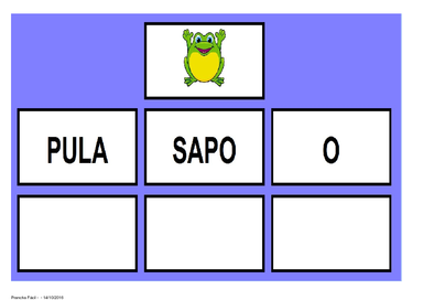| Nº Visualizações: 778 Nº Pranchas Relacionadas: 9 Tipo: Prancha Fácil Prancha Dinâmica: SIM Descrição: Essa atividade foi desenvolvida com o programa Prancha Fácil pelos participantes (pais, professores, fonoaudiólogos, pedagogos) da Oficina "Introdução ao Prancha Fácil" Nível: intermediário Autor: Projeto TO Brincando com a Fono Profissão: Universidade Federal do Rio de Janeiro E-mail: tobrincandoufrj@gmail.com | |||||||||