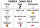 | Nº Visualizações: 736 Nº Pranchas Relacionadas: 4 Tipo: Prancha Fácil Prancha Dinâmica: NÃO Descrição: A brincadeira twister é feita com cartolinas, papéis coloridos, papelão e contact. Nível: iniciante Autor: Vera Vieira Profissão: Terapeuta Ocupacional E-mail: veravieira1@gmail.com | |||||||||