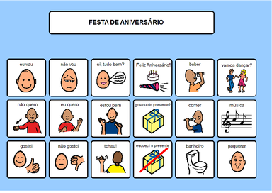 | Nº Visualizações: 1295 Nº Pranchas Relacionadas: 1 Tipo: BoardMaker Prancha Dinâmica: NÃO Descrição: Prancha para ser impressa.Pode ser utilizada em uma festa de aniversário. Nível: iniciante Autor: Priscila Rodrigues Profissão: Estudante de Terapia Ocupacional da UFRJ E-mail: priscila.rodriguesto@gmail.com | |||||||||
