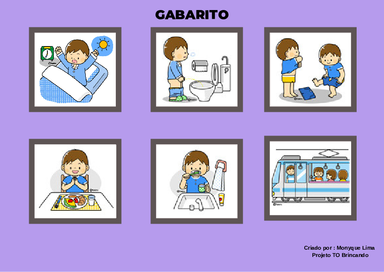 | Nº Visualizações: 554 Nº Pranchas Relacionadas: 12 Tipo: PowerPoint Prancha Dinâmica: NÃO Descrição: O jogo se refere as atividades cotidianas das manhãs, típicas de períodos escolares. O objetivo do jogo é desenvolver na criança senso de sequência de atividades de vida diária. Nível: iniciante Autor: Monyque Evans Profissão: Estudante de Terapia Ocupacional E-mail: nyque.esl@gmail.com | |||||||||